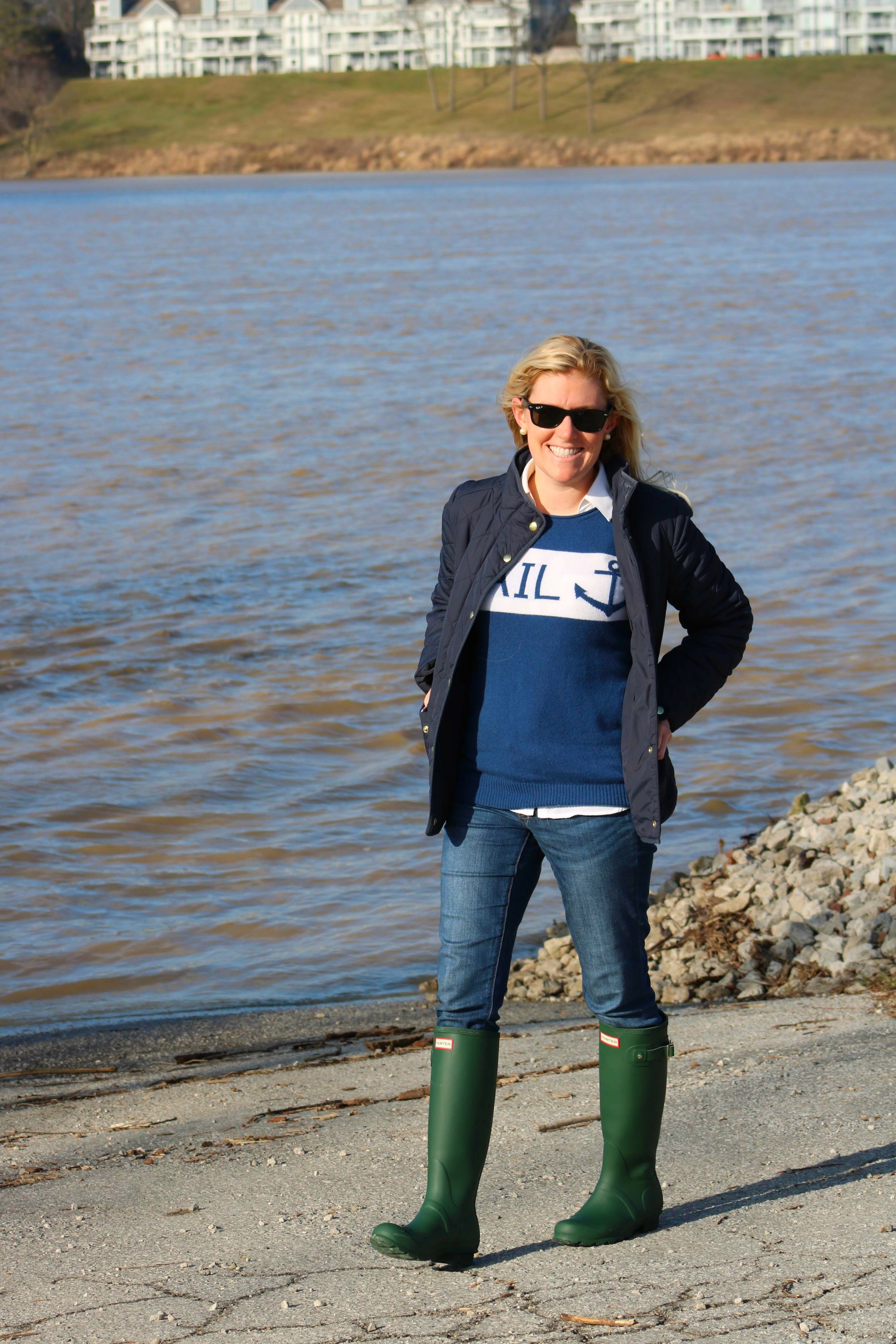 SAIL CASHMERE SWEATER | HUNTER BOOTS | J.CREW JEANS | WHITE BUTTON DOWN (SIMILAR) | KJP PEARL BRACELET | KJP LEATHER ROPE BRACELET | KJP PEARL EARRINGS