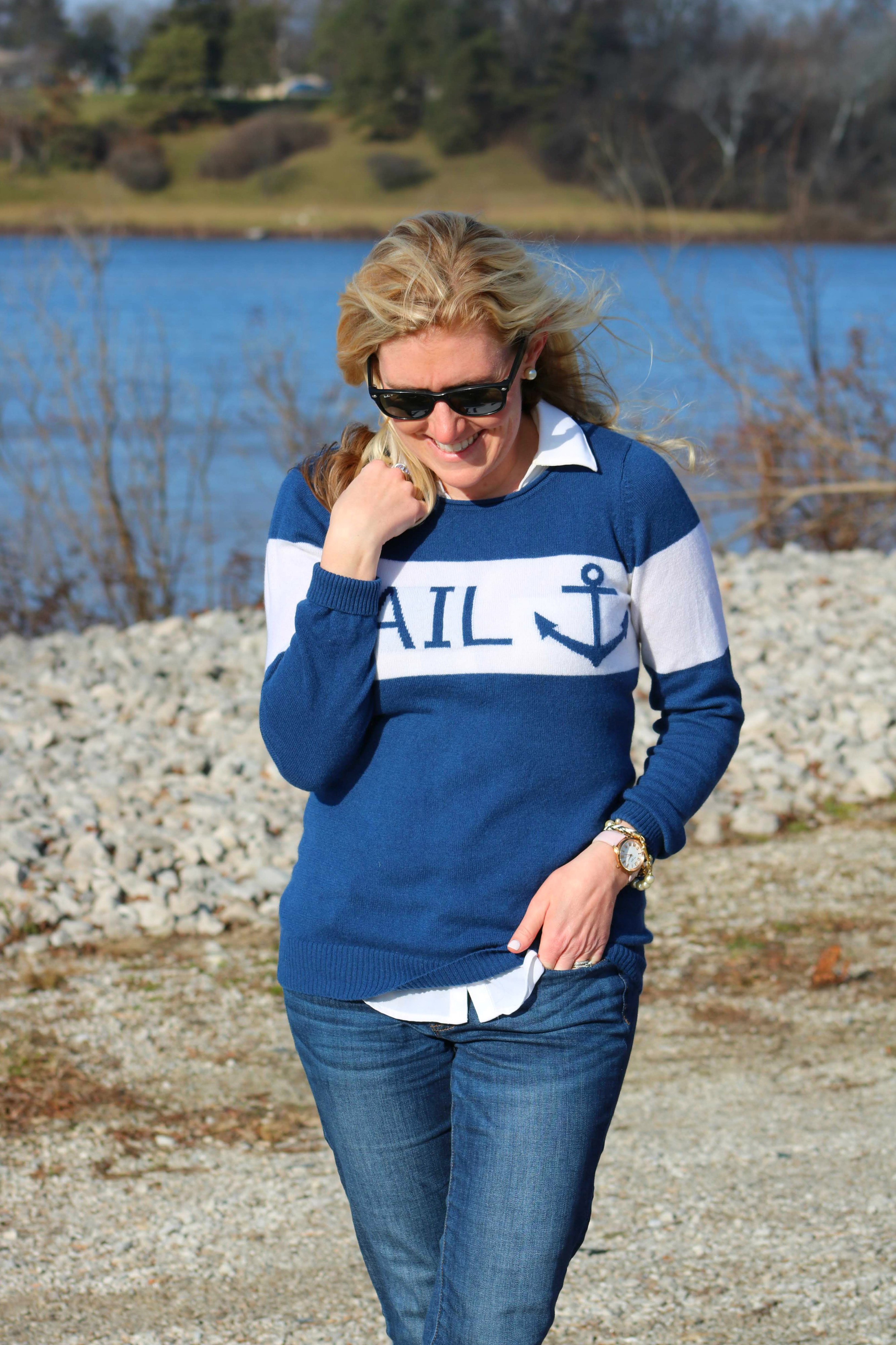 Nothing gets me more than a cute navy blue, nautical outfit. My mom surprised me with this adorable sweater from my favorite Rhode Island boutique for Christmas. It’s 100% cashmere and the one of the coziest pieces I own. Everything about the sweater is totally my style – from the navy and white color scheme, to the block “SAIL” letters, to the perfect anchor.