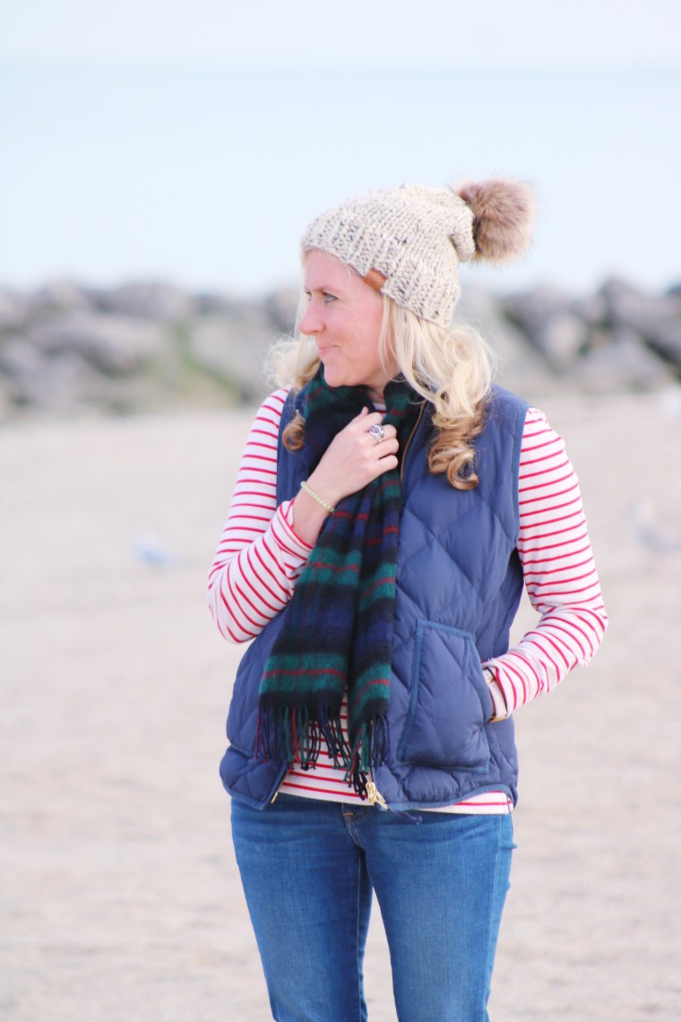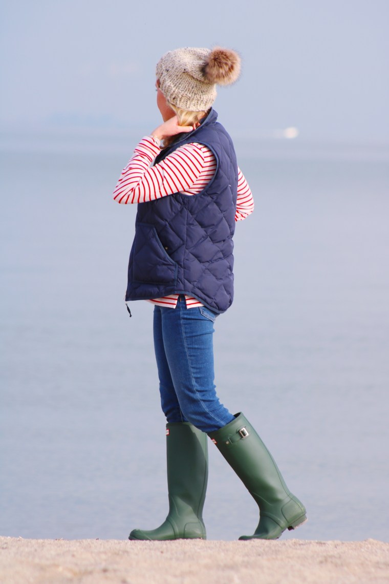 S.LYNCH KNIT HAT | J.CREW FACTORY VEST | J.CREW FACTORY STRIPED SHIRT | J.CREW FACTORY DENIM JEANS | HUNTER BOOTS