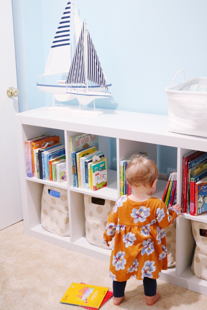 Time for a playroom update! We are moving along with styling and organizing this space. If you follow me on Instagram, you will have seen we purchased some shelves and organizational bins for Lilly’s books and toys! We might add another set of these items to the other side of the window, but we are waiting a little while longer to see if that’s needed.