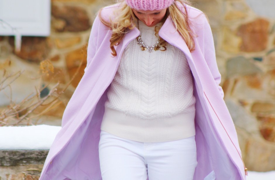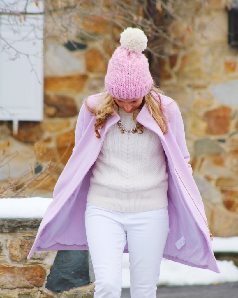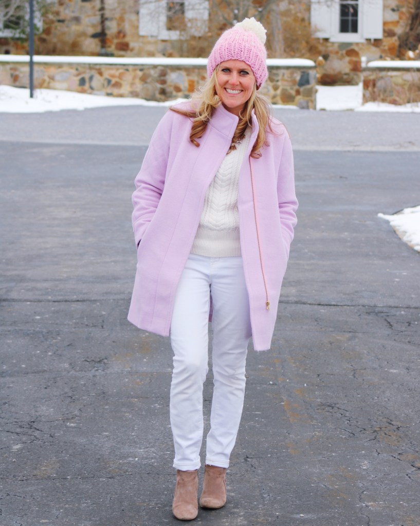 Styling an outfit with monochromatic colors can include different shades and tints of the same color. I would also recommend adding texture or pattern, which will create some depth and originality. For this outfit pairing, I chose bright white denim with a cream, cable knit sweater. And since it’s the middle of winter in Ohio, I added my lavender J.Crew Factory City Coat to keep me warm.