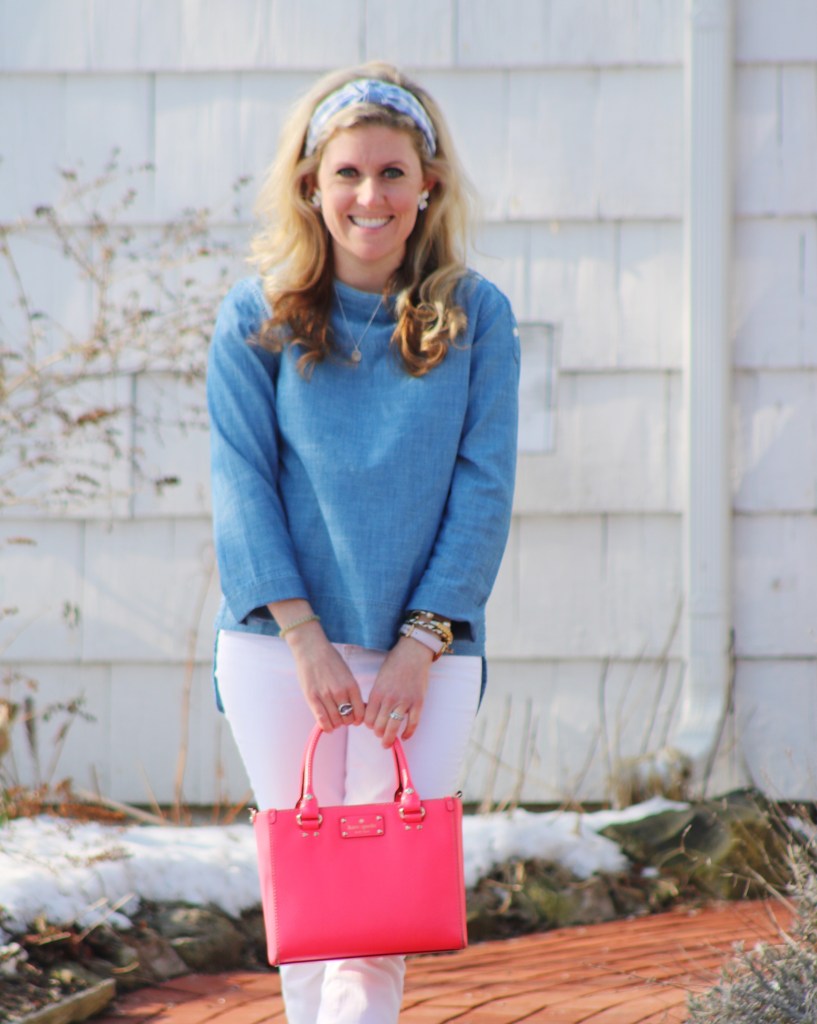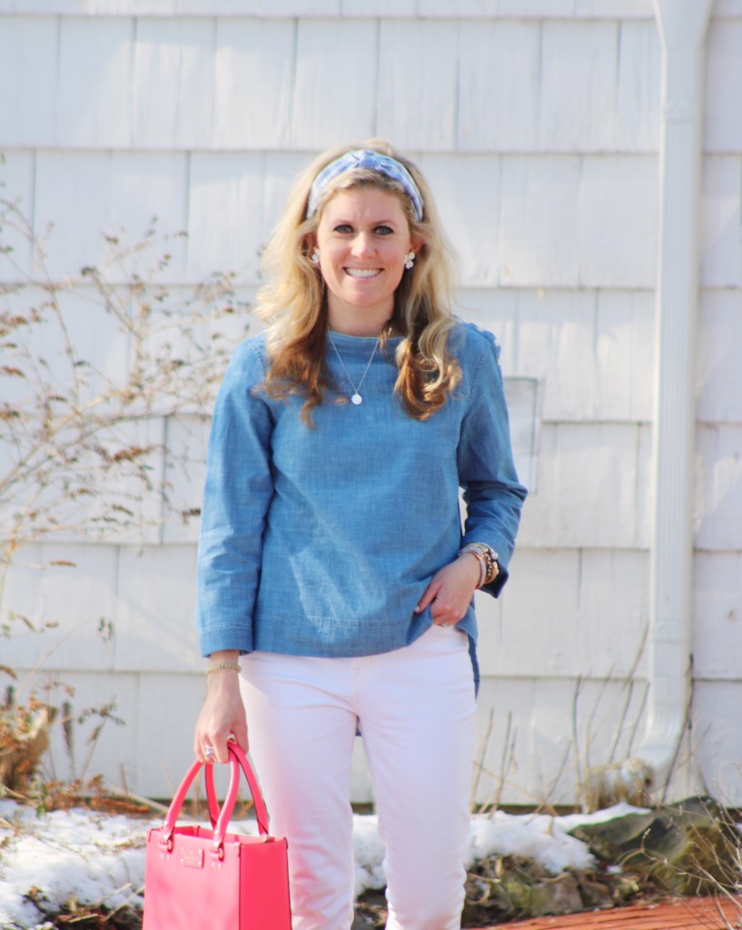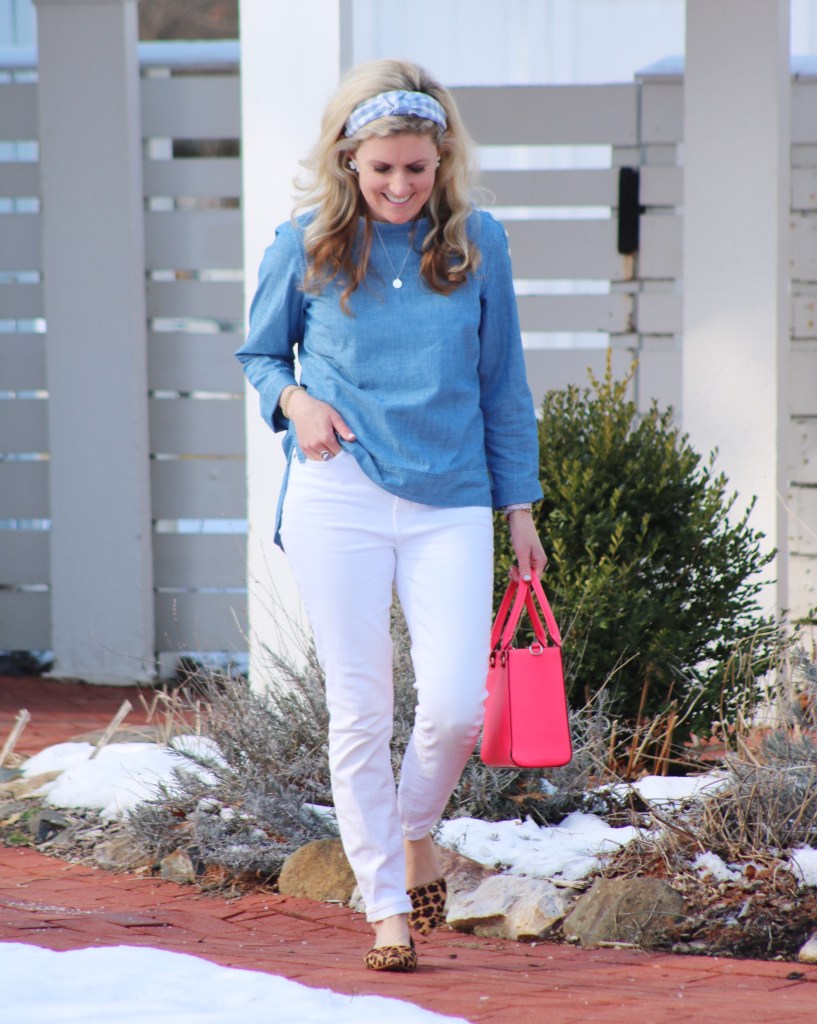 CHAMBRAY TOP | WHITE DENIM | GINGHAM HEADBAND | FLORAL EARRINGS | LEOPARD FLATS | KATE SPADE HANDBAG (OLD)