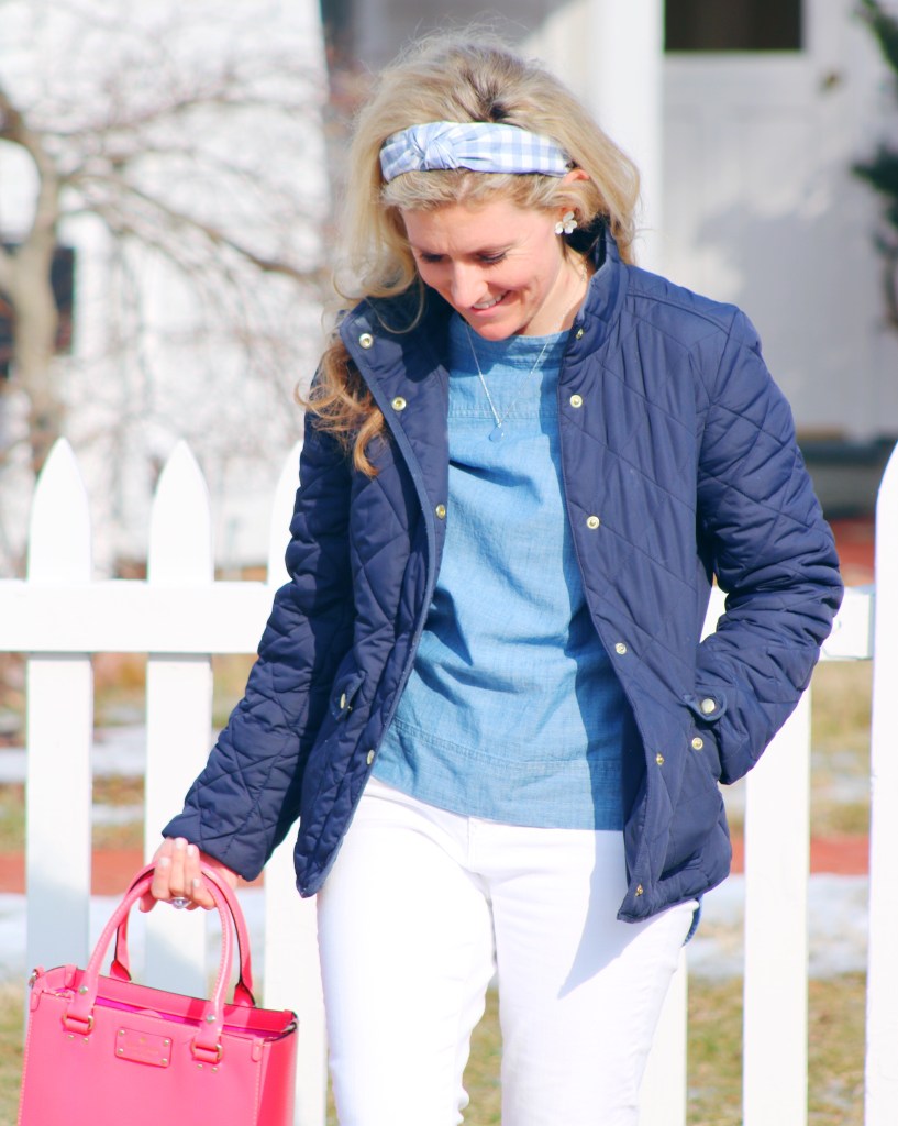 Gingham is the universal print for spring and summer. Adding a subtle touch of gingham with a headband (this one is also from Sea Marie Designs) is a perfect way to add a summer aesthetic to your outfit. You can also try a button down gingham top and pair it with your white denim. I have this shirt in navy, pink and light blue.