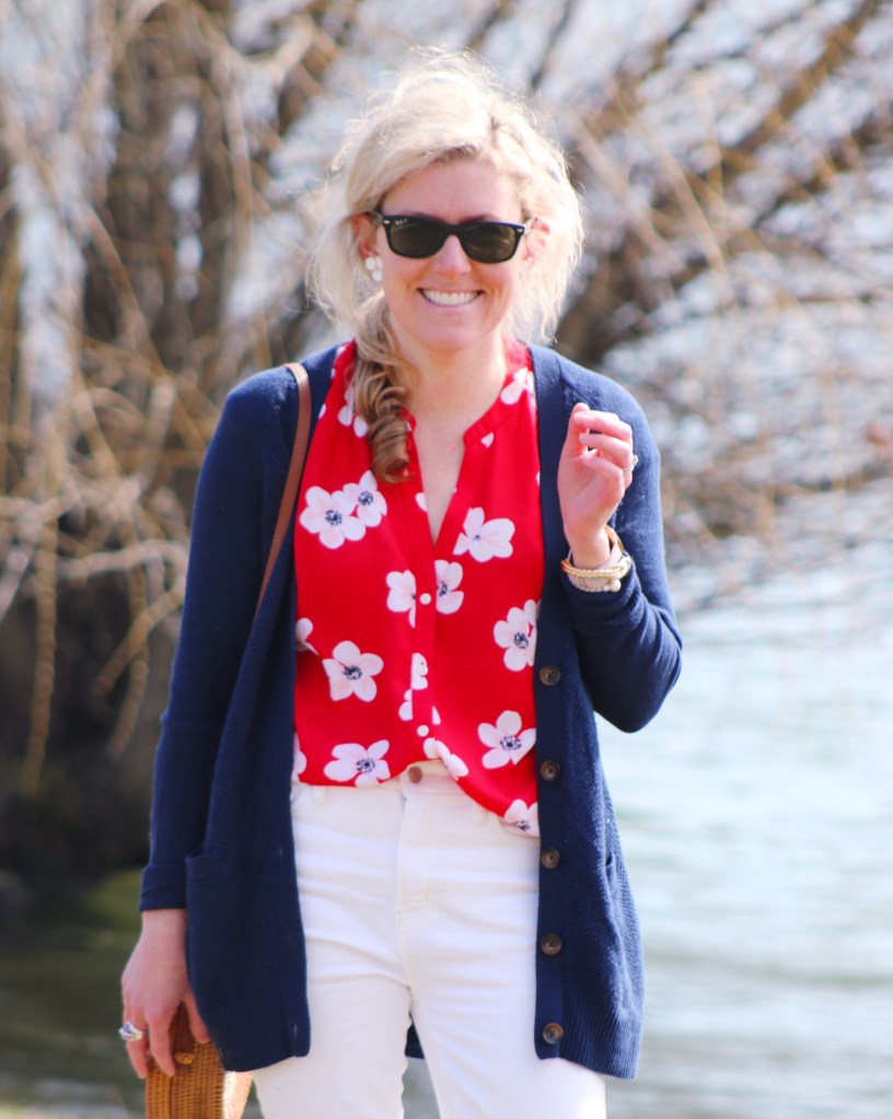 J. Crew Factory White Denim | J.Crew Factory Blouse | LOFT Cardigan (Similar) | Keds | Rattan Bag