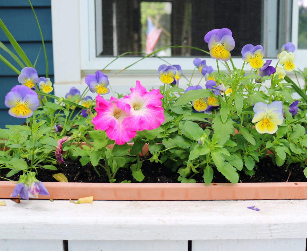 These are a new addition to our flower boxes this year, so the verdict is still out. BUT I did do some research and pansies thrive in cooler climates and partial sun. Even on 90 degree days, the deck stays pretty cool because of the natural shade. We will see how they do come July and August when it gets hot in Ohio, but right now, these heart shaped beauties are loving life in their window box outside our kitchen. I bought purple and yellow ones and planted some hot pink petunias with them and to see these bright, happy colors through my kitchen window brings me so much joy. Also a fun fact, pansies are edible! You can use pansies as a garnish on salads or desserts.