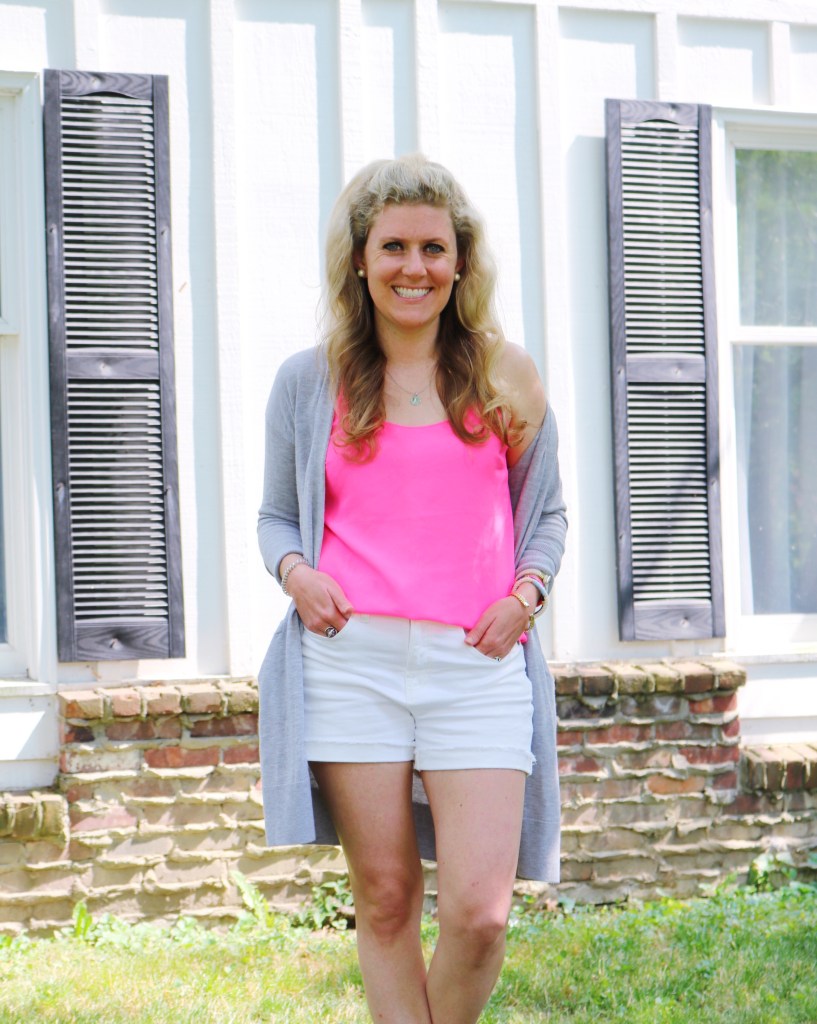 Because I’m always on the go and always chasing a very quick toddler, I tend to wear denim shorts (jean and white) with a t-shirt or v-neck cami top. I need to be able to move quickly, which means I cannot be fussing over my outfit. Adding this long grey cardigan to any of my “mom uniform” looks is a perfect, quick addition.