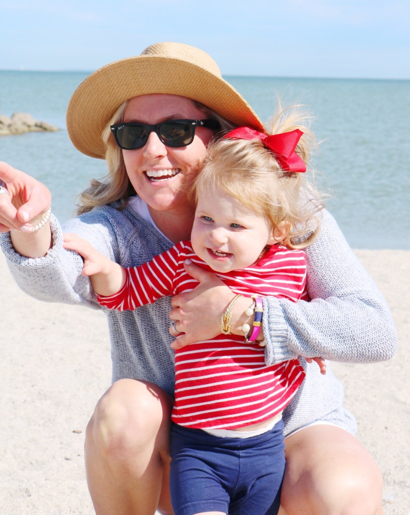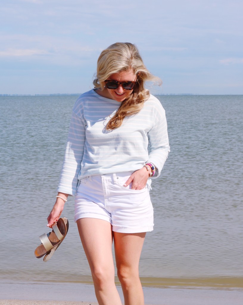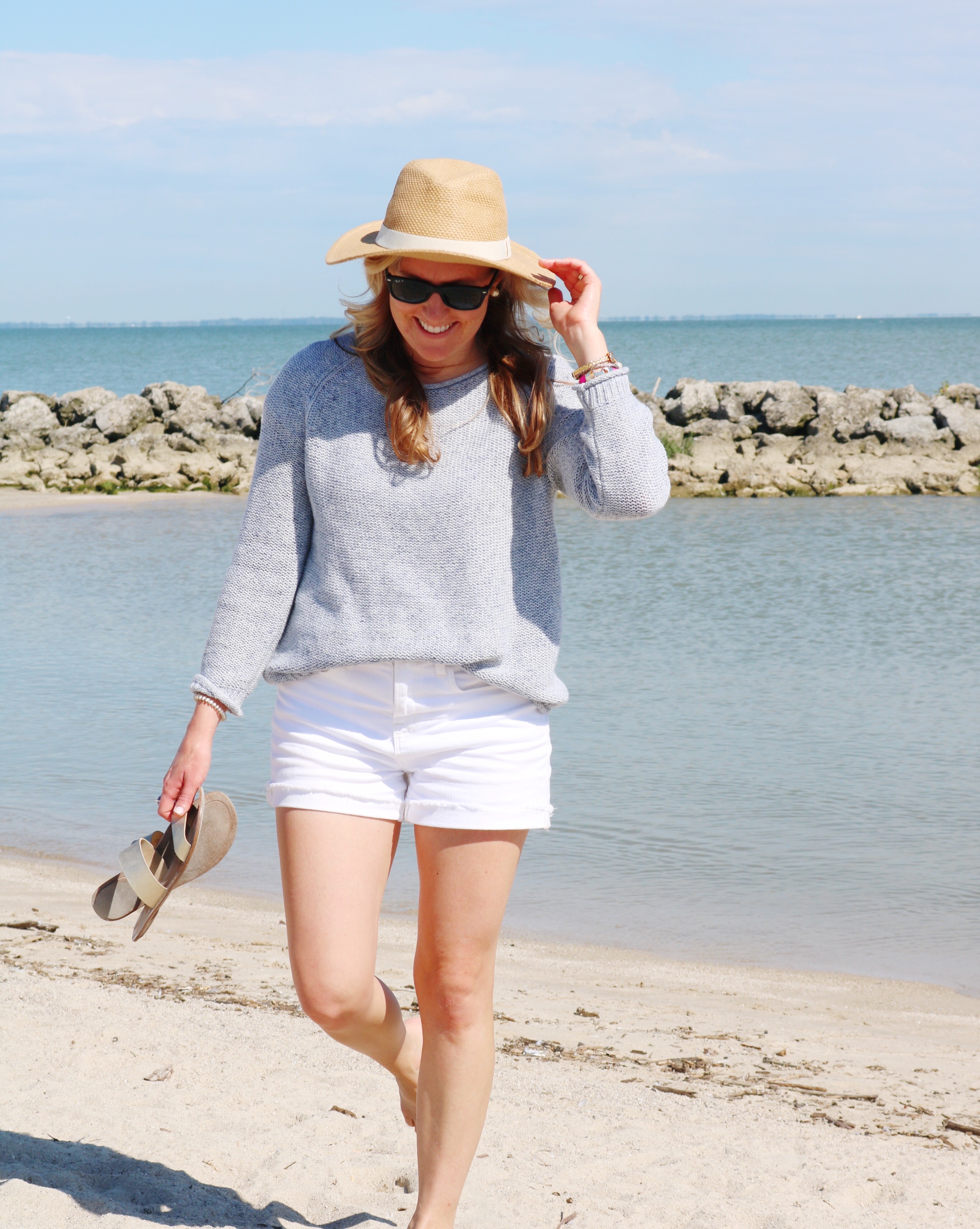 Every classic lady needs at least one beach sweater. I enjoy this grayish-blueish sweater from Old Navy, but I also just bought this pretty sky blue one from J.Crew. I’ve actually been pairing this beach sweater over my t-shirt dresses lately, but for our beach day, I chose white cutoff denim shorts with a basic white tee underneath. This time of year the mornings are chilly so you definitely need a sweater, but I also suggest dressing in layers, hence the white tee underneath.