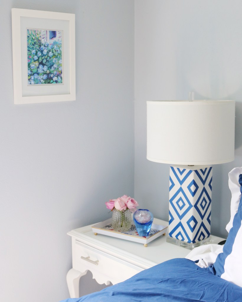 I kept the styling of this example simple for our master bedroom end table with a small vase of fresh flowers and my favorite vase of sea glass. This ultra feminine look is timeless and chic and would brighten up anyone’s morning.