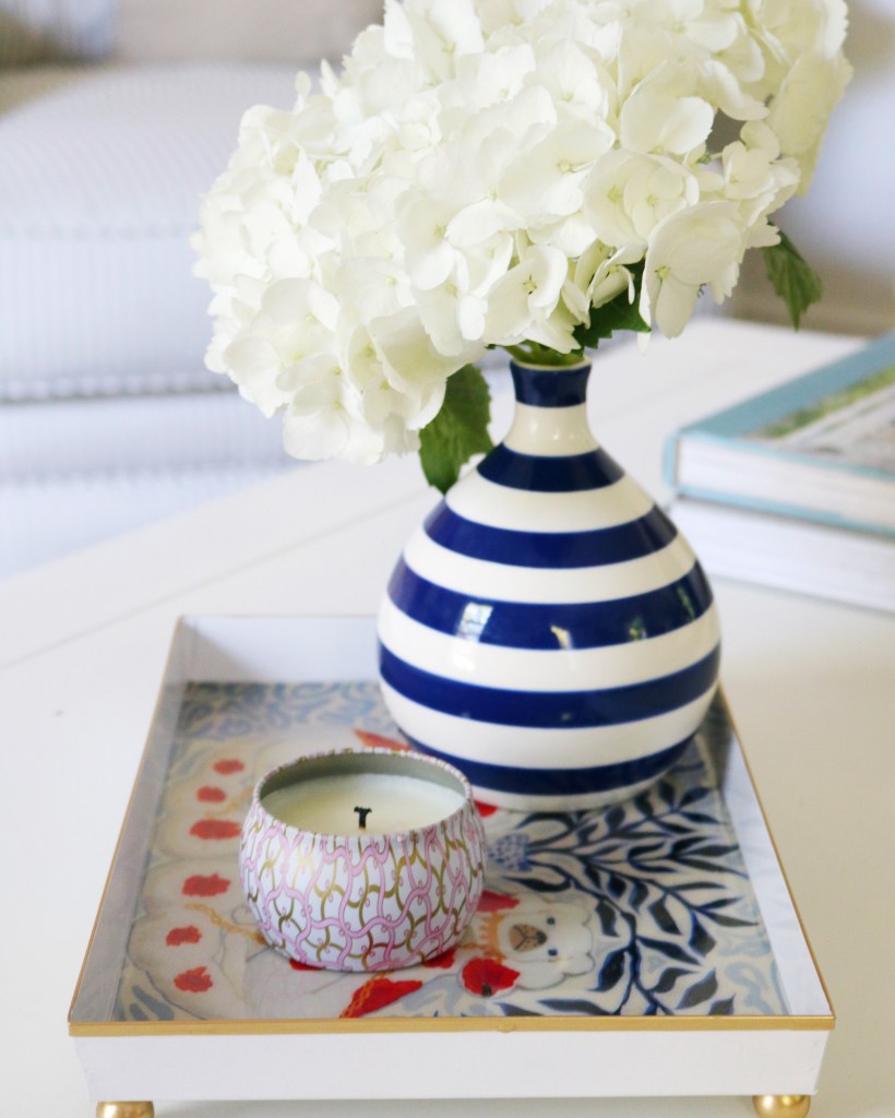 This tray is perfect in my living room. I kept the styling simple with a single fresh hydrangea and a lovely smelling candle. All of these details create a welcoming ambiance, which is perfect for the living room as it’s the first room a guest enters when they come into our home.