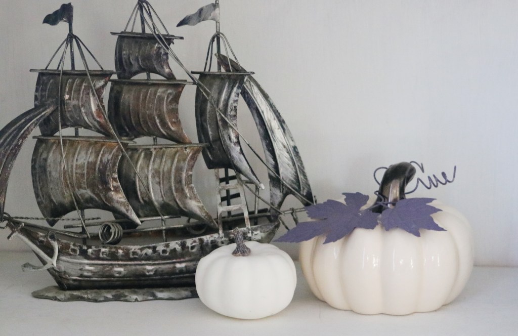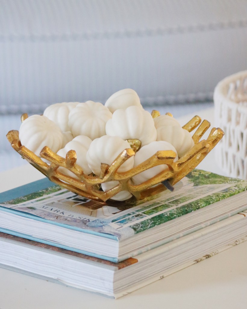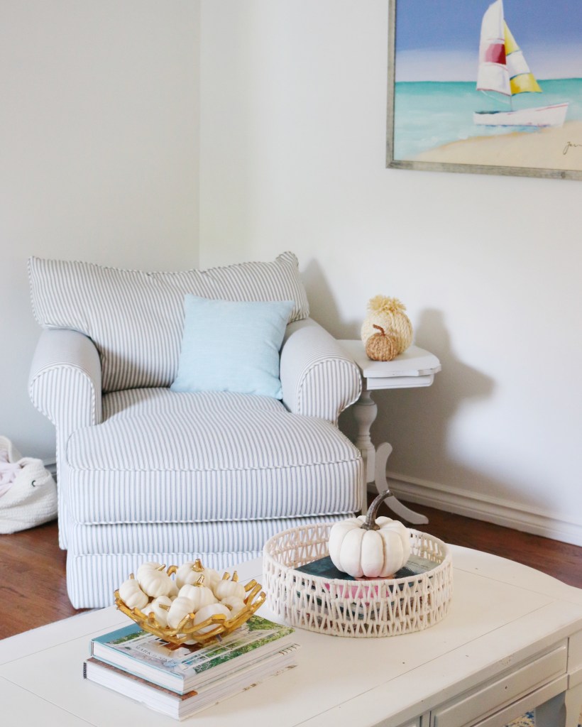 If you want to stay true to your coastal aesthetic, you have to stick to the colors already in your space. I choose to decorate with pumpkins in shades of blue and white since my home is based around those colors. You can also go with a softer color palette (light blues and greens, grays, tans, creams) if that’s the vibe you already have in your space.