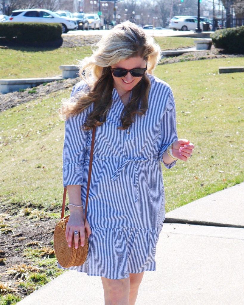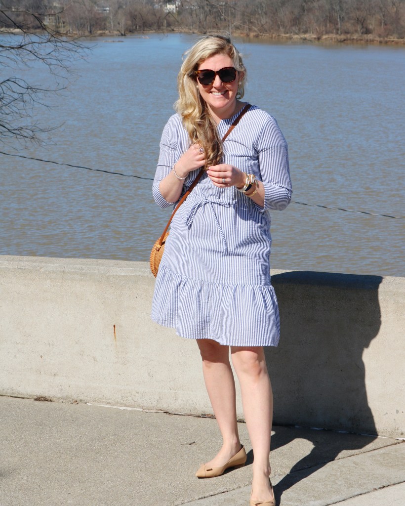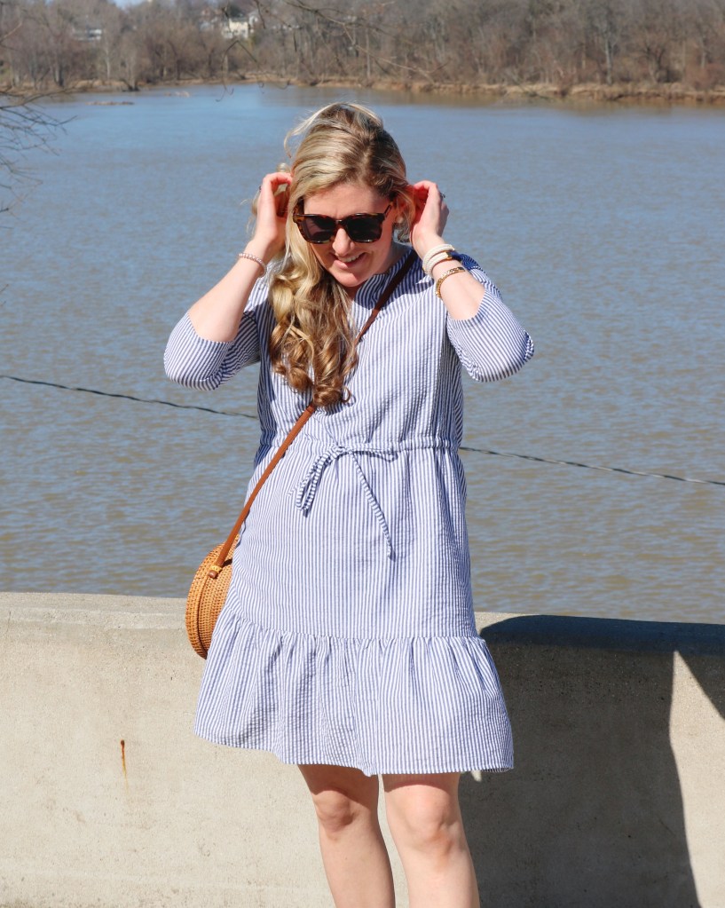 I think it goes without saying that this style of dress is completely on brand for me. I’m not sure what detail I love the most: the navy stripes, the seersucker, the flirty tiered skirt, the adjustable waist, or the nautical gold buttons. All of these details are just perfect. This style of dress will be forever classic and timeless and I cannot wait to wear it year after year.