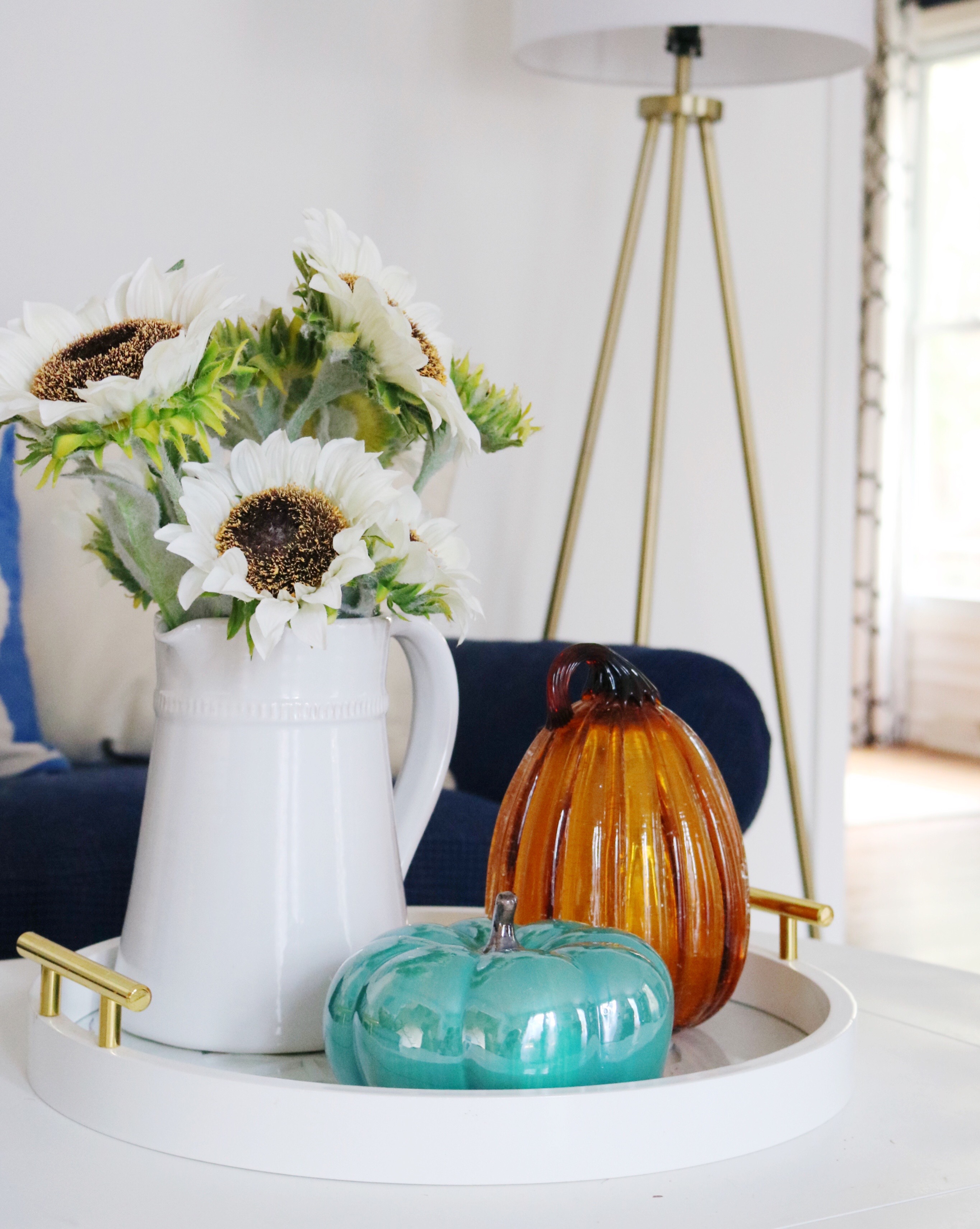 So I’ve completely switched to fall decor that is blue and white (I’ll occasionally throw in a mini orange pumpkin, mostly for L).  This post is for anyone struggling to find a nice balance of mixing your vibe with seasonal decor, I’m providing some ideas that have worked for me.  Please remember, I am not an expert in interior design – I just enjoy decorating our home and making it aesthetically pleasing to my eye.