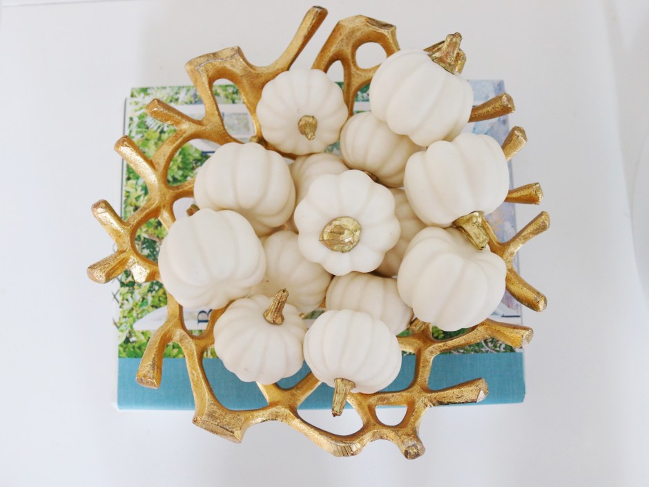 Another idea – Target and Amazon offer bulk plastic pumpkins in white for super cheap. I bought a few bags of these and I love to throw them in a decorative bowl. This year I actually found some nautical rope pumpkins so I ordered two for our family room!