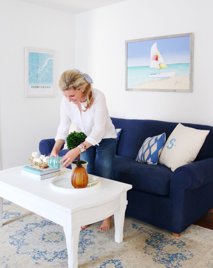 I love our home in the spring and summer.  The blue and white color scheme always feels so fresh and calming.  I love the peaceful vibe that the coastal details provide.  But, come fall and winter, I struggle big time with decorating.  I enjoy the cozy aesthetic that these two seasons bring, but sometimes I struggle to combine the darker and muted shades of fall and winter with my bright blue and white.