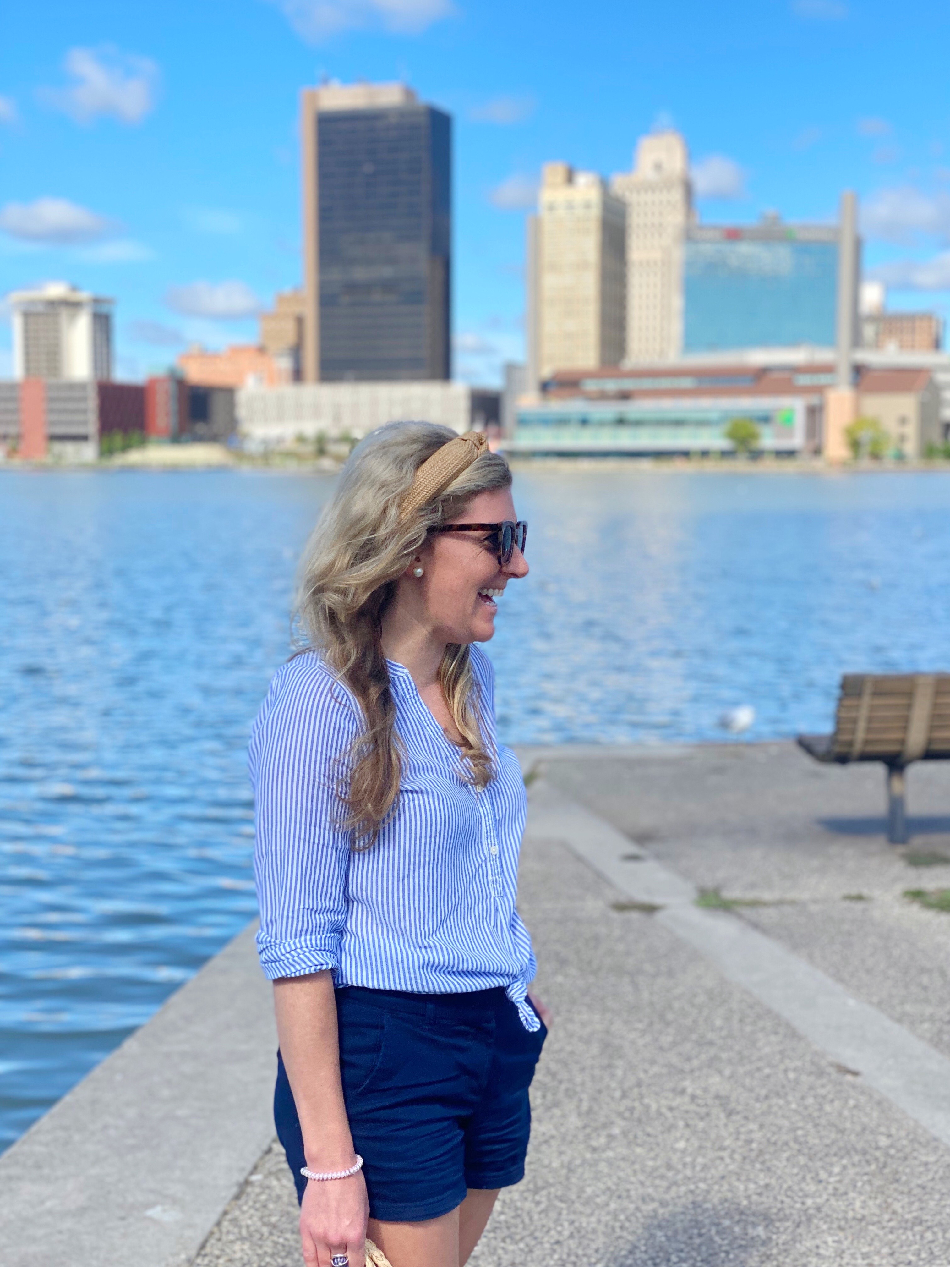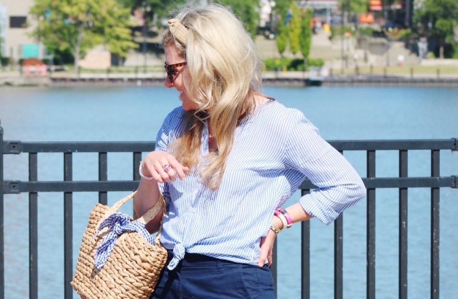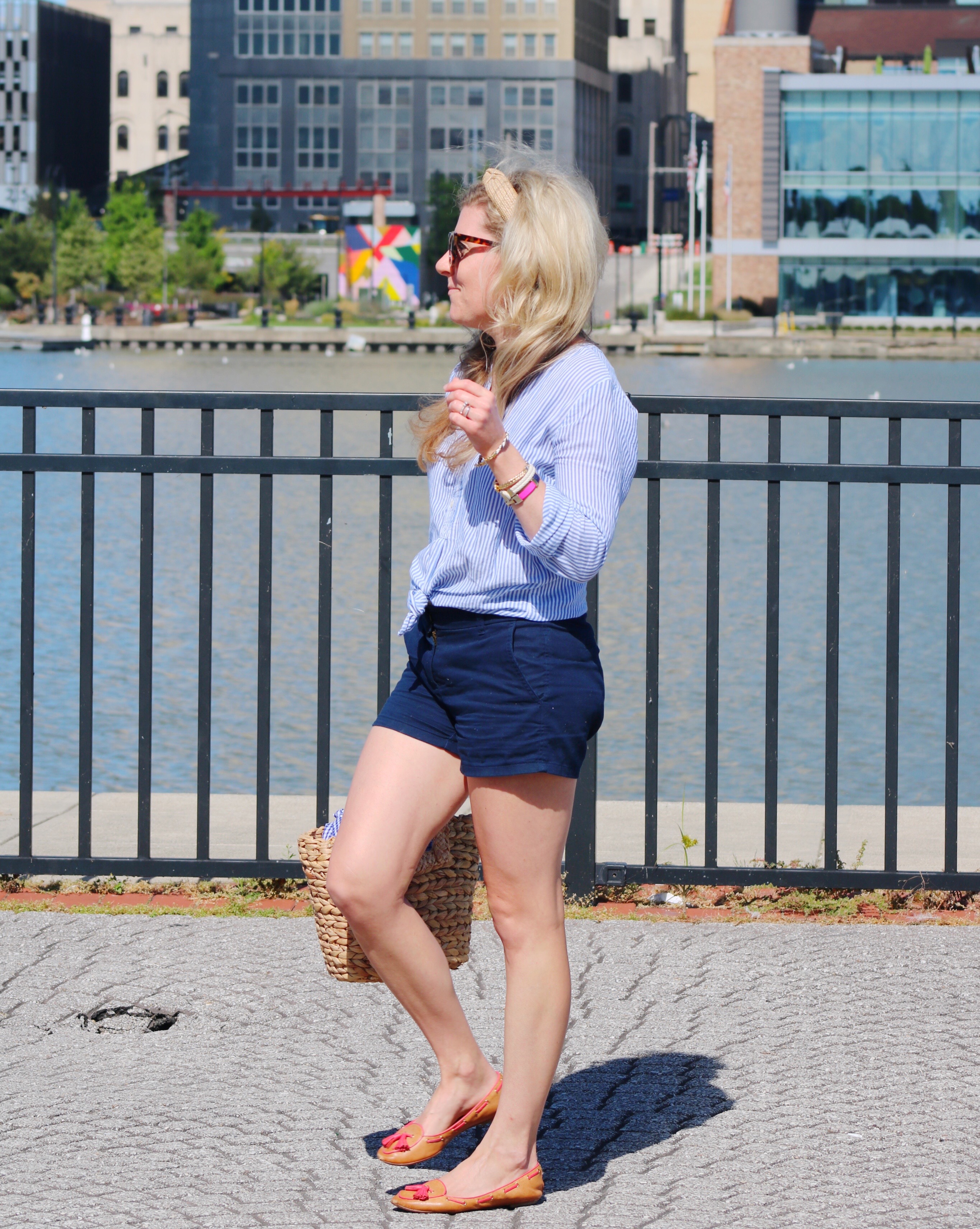 For this outfit, I styled a three quarter length button up tunic in summer stripes (fall style with a summer print), navy chino shorts in navy (summer shorts in a fall-ish color), swapped out my sandals for tassel loafers, and kept my summer straw tote and rattan headband – it is summer after all.