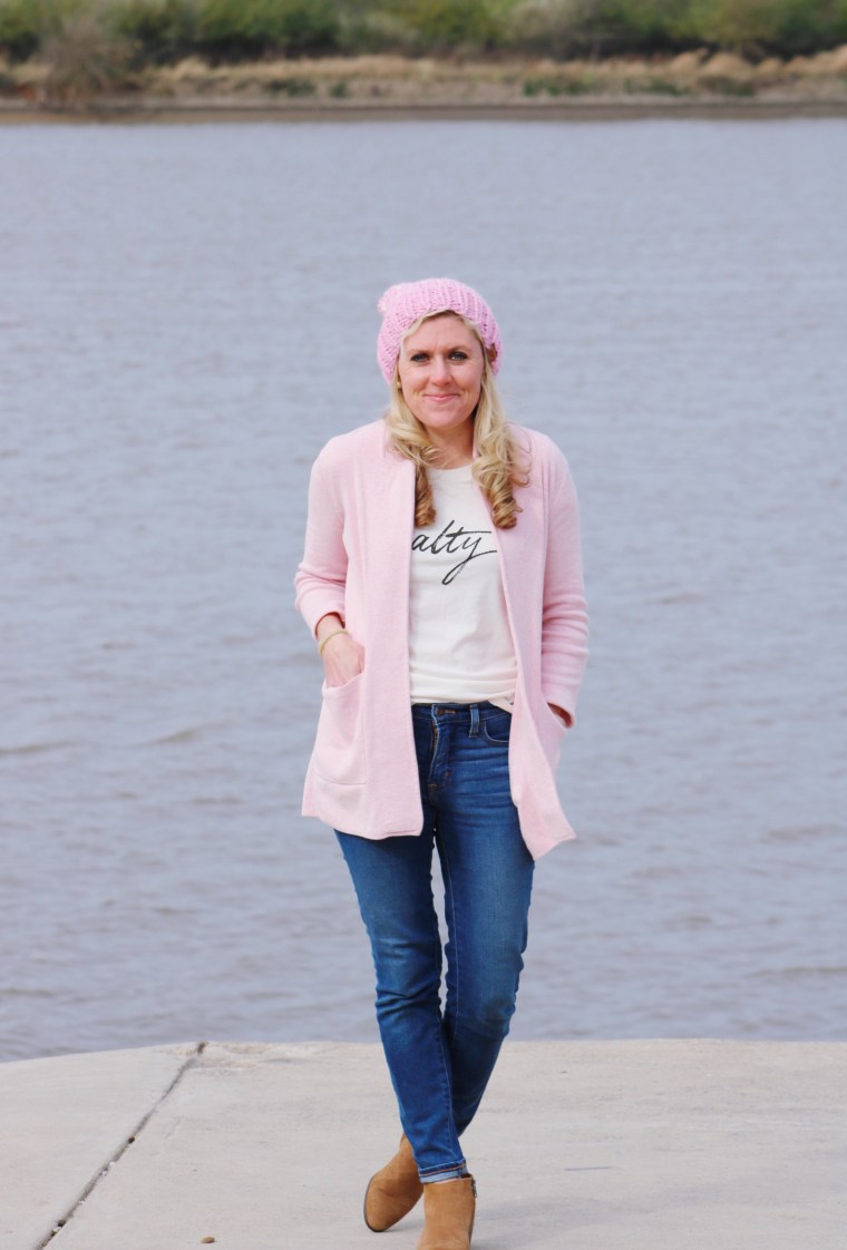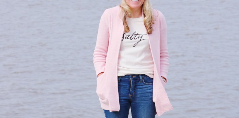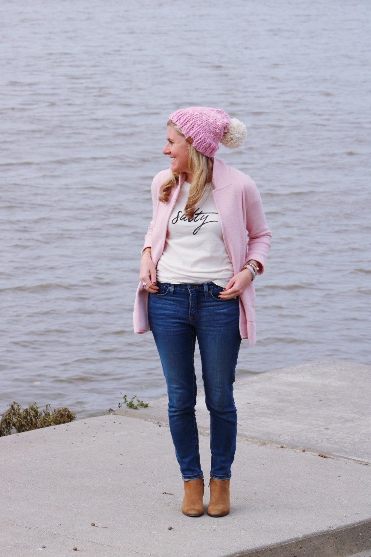 My weekend look usually includes a t-shirt and jeans with a sweatshirt. By swapping out my sweatshirt with this blazer sweater, my look is still casual, but a teensy bit more out together. And comfy as heck!